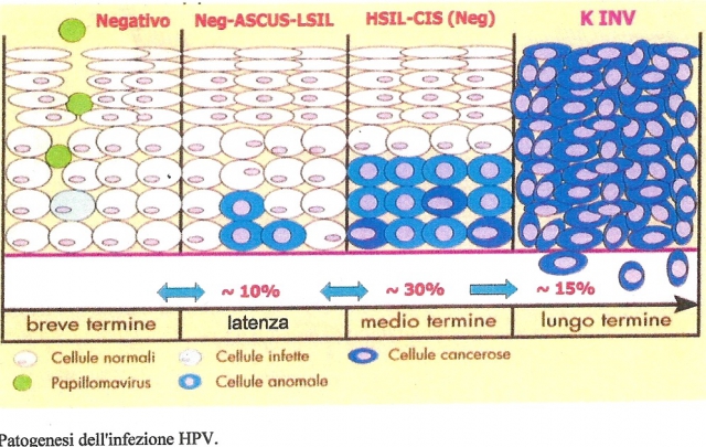 quando si ha un'infezione da HPV, il virus si trova nella parte superficiale della membrana e non modifica le cellule dando quindi esito negativo per le lesioni (prima colonna dello schema);