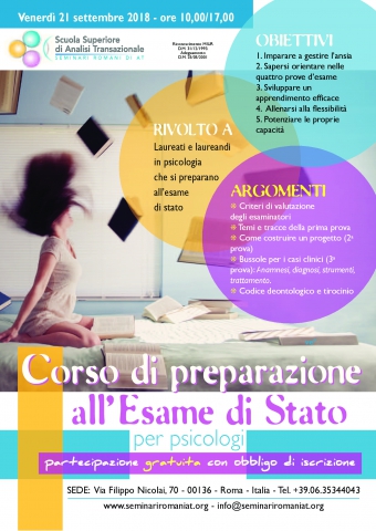 Sono aperte le iscrizioni al Corso di preparazione gratuito all'Esame di Stato per Psicologi presso la Scuola Superiore di Analisi Transazionale "Seminari Romani di Analisi Transazionale" di Roma.Ai laureati e laureandi che sono interessati si ritiene utile allegare il modulo di iscrizione al Corso da inviare via mail debitamente compilato e firmato.