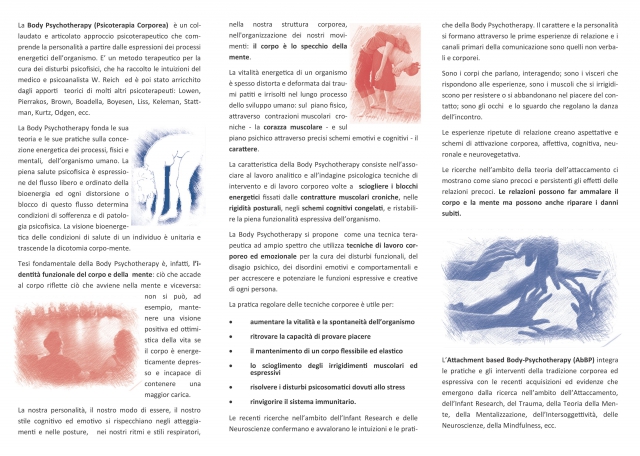 Attachment-based body psychotherapy group Il processo di cambiamento, trasformazione e crescita personale richiede il riconoscimento e l'integrazione dei propri schemi energetico-emozionali e cognitivo-comportamentali. Il gruppo offre l'opportunità di osservarli e di esplorarli all'interno di un contesto di caldo sostegno, contatto e autenticità. Il gruppo, le dinamiche interattive, le attività corporee ed espressive proposte potenziano e intensificano il processo esplorativo e trasformativo dei partecipanti.