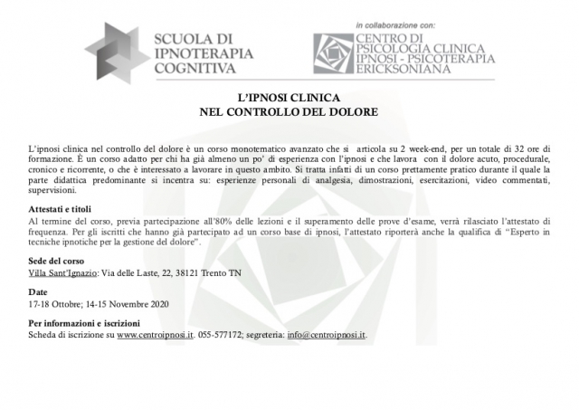 “L’ipnosi clinica nel trattamento del dolore e delle sindromi algiche” è un corso monotematico avanzato che si articola su 2 week-end, per un totale di 32 ore di formazione. È un corso adatto per chi ha già almeno un po’ di esperienza con l’ipnosi (induzione ipnotica, approfondimento della trance, comunicazione ipnotica, fenomenologia dell’ipnosi profonda) e che lavora con il dolore e i disturbi algici, o che è interessato a lavorare in questo ambito. Si tratta infatti di un corso prettamente pratico durante il quale la parte didattica predominante si incentra sulle dimostrazioni, sulle esercitazioni e sulle supervisioni.Al termine del corso i partecipanti avranno appreso le tecniche dell’ipnosi clinica nell’ambito del dolore acuto, procedurale, cronico e ricorrente, e le potranno applicare nel loro ambito lavorativo. Saranno inoltre in grado di riconoscere gli stati di trance spontanei dei pazienti, e di saper utilizzare la comunicazione ipnotica e la relazione ipnotica, per facilitare non solo un sollievo dal dolore, ma anche uno stato di tranquillità, rilassamento e benessere nei loro pazienti.