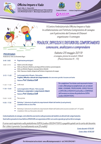 Il convegno é organizzato dall'Officina Imparo e Vado in collaborazione con l’Istituto Comprensivo di Lavagna e con il patrocinio del Comune di Chiavari con relatore il Prof. Gianluca Daffi.Contestualmente al convegno, verrà allestita una mostra sulla percezione dei bambini con disturbi del comportamento.