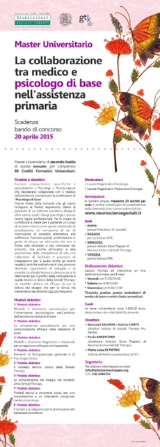 L’Università Cattolica del Sacro Cuore di Roma, Facoltà di Medicina e Chirurgia “A.Gemelli”, in collaborazione con l’Istituto di Gestalt Therapy hcc Kairòs (GTK) e l’Istituto di Nino Trapani di Neuroscienze e Gestalt, propone, per l’anno accademico 2015, il Master Universitario di secondo livello in: “LA COLLABORAZIONE TRA MEDICO E PSICOLOGO DI BASE NELL’ASSISTENZA PRIMARIA”.In linea con il contributo scientifico ed esperenziale del progetto di ricerca “Medico di base e Psicologo Insieme, portato avanti nella provincia di Ragusa dal 2011 dall’Istituto GTK con la collaborazione dei Medici di Medicina Generale (MMG) ed i Pediatri di Libera Scelta (PLS) , il Master si pone come obiettivo quello di formare Psicologi e Psicoterapeuti che desiderano apprendere competenze utili per la collaborazione professionale nell’assistenza primaria per la professione di “Psicologo di base”: