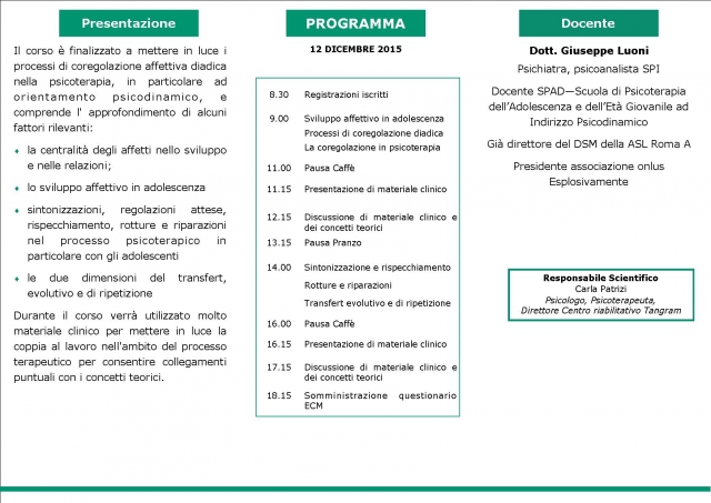 Obiettivo del corso: Partendo da quanto emerge dalle ultime conoscenze dell’infant research e delle neuroscienze, sviluppare una maggiore sensibilità alle tematiche degli affetti in psicoterapia ed alla loro gestione ai fini trasformativi in particolare con gli adolescenti. Il modello teorico fa principalmente riferimento alla psicoterapia psicodinamica, ma molti argomenti trattati sono importanti anche in altri approcci e modelli.