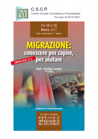 24/03/2017 al 25/03/2017 14/03/2017Il mini corso proposto intende fornire un quadro storico e geopolitico del fenomeno Immigrazione,tracciando una breve panoramica sulla storia del Continente Africano.Si passerà poi a fornire informazioni generali sulla Psicologia delle Migrazioni, sottolineando l'universalità del fenomeno della Migrazione nella storia.Si procederà poi a fornire elementi di etnopsichiatria e di approccio antropologico al Migrante,cercando di delineare i principali elementi sui Diritti Umani e la Protezione Internazionale.In ultimo ma certo non meno importante gli elementi del Pronto soccorso Psicologico e del ruolo del terzo settore nella gestione del fenomeno e dell'emergenza sociale.
