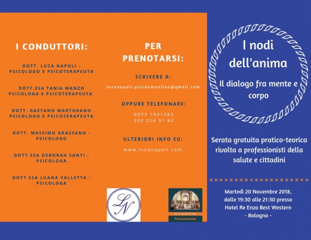 Incontro gratuito teorico-pratico promosso dall'Istituto di Psicoterapia Psicoumanitas e dallo Studio Napoli di Pistoia, rivolto a professionisti della salute e cittadini interessati.Tramite l’utilizzo di alcune tecniche proprie dell’approccio umanistico-bioenergetico si esploreranno emozioni e vissuti riguardo al tema dell’ansia – una delle manifestazioni più note ed evidenti che il nostro corpo ci restituisce – lasciando spazio allos cambio fra persone, con la possibilità di condividere domande e avere risposte che nascono dall’esperienza di ognuno.