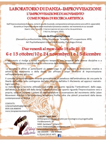 Un ciclo di incontri di danza-improvvisazione e ricerca artistica, il venerdì dalle 19.00 alle 21.15, condotti da Elisabetta Colace, danzamovimentoterapeuta, psicologa e con un solido background di danzatrice ed una lunga esperienza alle spalle. Gli incontri si rivolgono a chi desideri indagare e sperimentare il proprio processo creativo, attraverso il corpo ed il movimento.