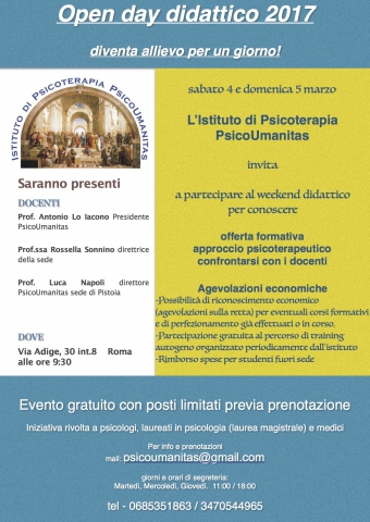 In occasione dell'apertura dell'anno scolastico l'Istituto di psicoterapia PsicoUmanitas apre le porte a chi fosse interessato al modello integrato umanistico-bioenergetico.Sarà possibile essere allievo della scuola per un giorno facendo esperienza della peculiare offerta formativa fornita dai docenti.