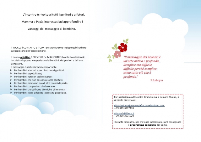Presentazione del "Corso Massaggio Neonatale Integrato: fa bene a me e al nostro Bimbo"L’incontro è rivolto ai tutti i genitori e a futuri, Mamma e Papà, interessati ad approfondire i vantaggi del massaggio al bambino.