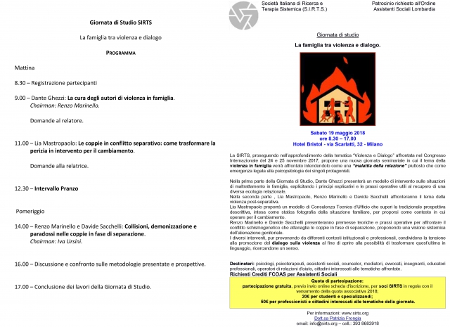 Durante la giornata seminariale il tema della violenza in famiglia, verrà affrontato come una " malattia della relazione" piuttosto che come emergenza legata alla psicopatologia dei singoli protagonisti.Verranno presentati un modello d'intervento sulle situazioni di maltrattamento in famiglia e il tema della violenza post-separativa.