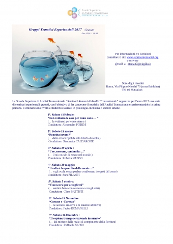 Anche nel prossimo 2017 la Scuola Superiore di Analisi Transazionale “Seminari Romani di Analisi Transazionale” organizza una serie di seminari esperienziali gratuiti ed altre attività seminariali, con l'obiettivo di far conoscere il modello dell'Analisi Transazionale sperimentandolo in prima persona.I seminari sono rivolti a studenti o laureati in psicologia, medicina e scienze umane.