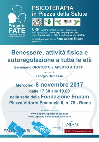 Segnaliamo l'iniziativa del CRP (Centro per la Ricerca in Psicoterapia) nell'ambito dei Progetti FATE (Favorire l'Accesso alle psicoTerapie Efficaci) e "Piazza della Salute", realizzata in collaborazione con la Fondazione Enpam e con il patrocinio dell'Ordine degli Psicologi del Lazio e della Società Italiana di Medicina Psicosociale (SIMPS).Conduce il seminario GRATUITO E APERTO A TUTTI: Giorgio Damassa