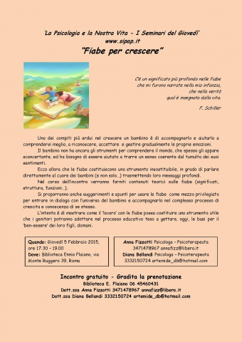 Nel corso dell’incontro verranno forniti suggerimenti e spunti per usare le fiabe come mezzo privilegiato per entrare in dialogo con l’universo del bambino e accompagnarlo nel complesso processo di crescita e conoscenza di sé stesso.
