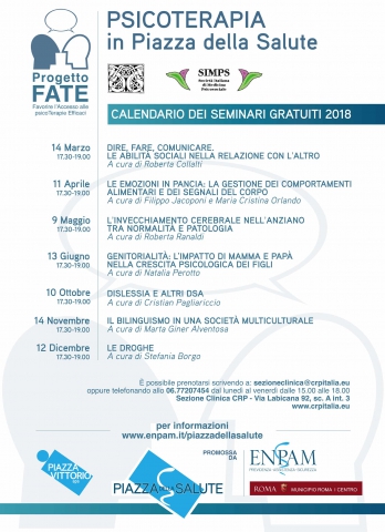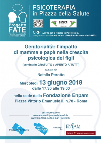 Genitorialità: l'impatto di mamma e papà nella crescita psicologica dei figli In collaborazione con la Fondazione Enpam e con il patrocinio della Società Italiana di Medicina Psicosociale (SIMPS), il CRP (Centro per la Ricerca in Psicoterapia) anche per il 2018 partecipa all'iniziativa Piazza della Salute con il Progetto FATE (Favorire l'Accesso alle psicoTerapie Efficaci), un ciclo di seminari GRATUITI e APERTI A TUTTI.