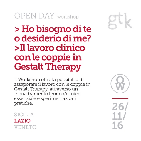 Il Workshop offre la possibilità di assaporare il lavoro con le coppie in Gestalt Therapy, attraverso un inquadramento teorico/clinico essenziale e sperimentazioni pratiche. L’incontro è gratuito e si rivolge a psicologi, medici, studenti e laureandi in medicina e psicologiaDurante l’evento sarà possibile ricevere informazioni sulla Scuola di Specializzazione in Psicoterapia della Gestalt o prenotare un colloquio conoscitivo con uno dei nostri Docenti. E’ necessaria la prenotazione, scrivendo all’indirizzo email roma@gestaltherapy.it