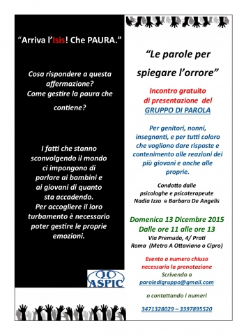 L’incontro gratuito costituisce la presentazione del Gruppo di Parola per genitori, nonni, insegnanti, e per tutti coloro che vogliono dare risposta e contenimento alle reazioni dei più giovani e anche alle proprie.