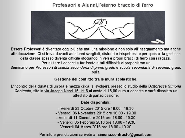 Essere Professori è diventato oggi più che mai una missione e non solo all'insegnamento ma anche all'educazione. Ci si trova davanti ad alunni svogliati, distratti e irrispettosi, e per questo la gestione della classe spesso diventa difficile sfociando in veri e propri bracci di ferro con i ragazzi.Per aiutare i docenti a far fronte a tali difficoltà vi proponiamo un Seminario per Professori di scuola secondaria di primo grado e scuola secondaria di secondo grado sulla