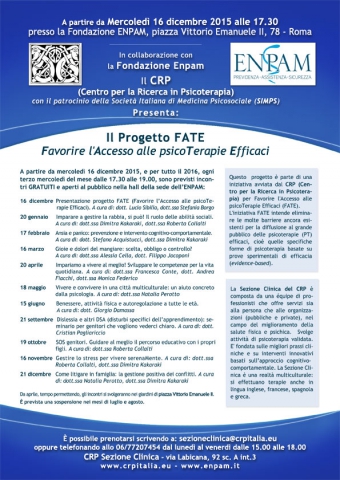 Il seminario, presentato dal CRP (Centro per la Ricerca in Psicoterapia) nell'ambito del progetto FATE (Favorire l'Accesso alle psicoTerapie Efficaci), è a cura della dott.ssa Dimitra Kakaraki e della dott.ssa Roberta Collalti; come tutti gli altri seminari del Progetto FATE è GRATUITO e APERTO A TUTTI. E' possibile prenotarsi scrivendo una mail a sezioneclinica@crpitalia.eu oppure telefonando allo 06/77207454 dal lunedì al venerdì dalle 15.00 alle 18.00 (CRP Sezione Clinica, via Labicana 92).